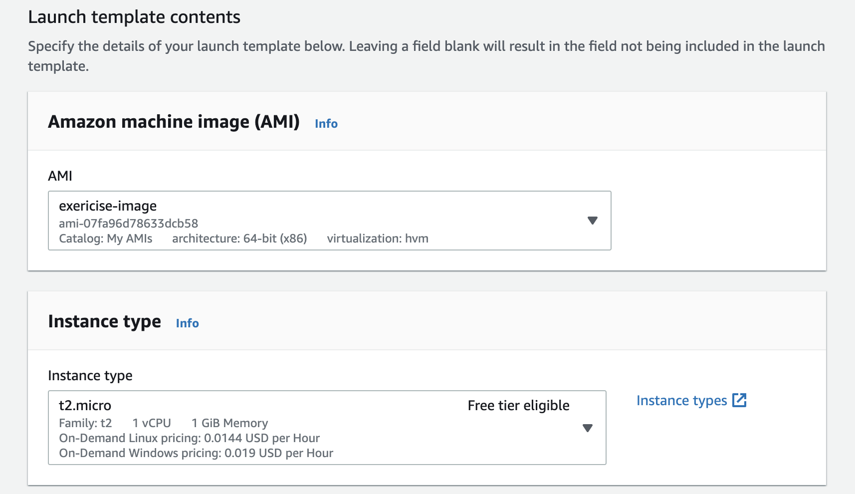 위 사진은 시작 템플릿 생성 시 앞에서 생성한 AMI 이미지를 추가한 예시입니다. 기본적으로 템플릿 이름, AMI ID, 인스턴스 타입, 보안그룹, key-pair 등의 설정을 지정해 줍니다. 해당 사항들을 설정 후 시작 템플릿을 생성합니다.