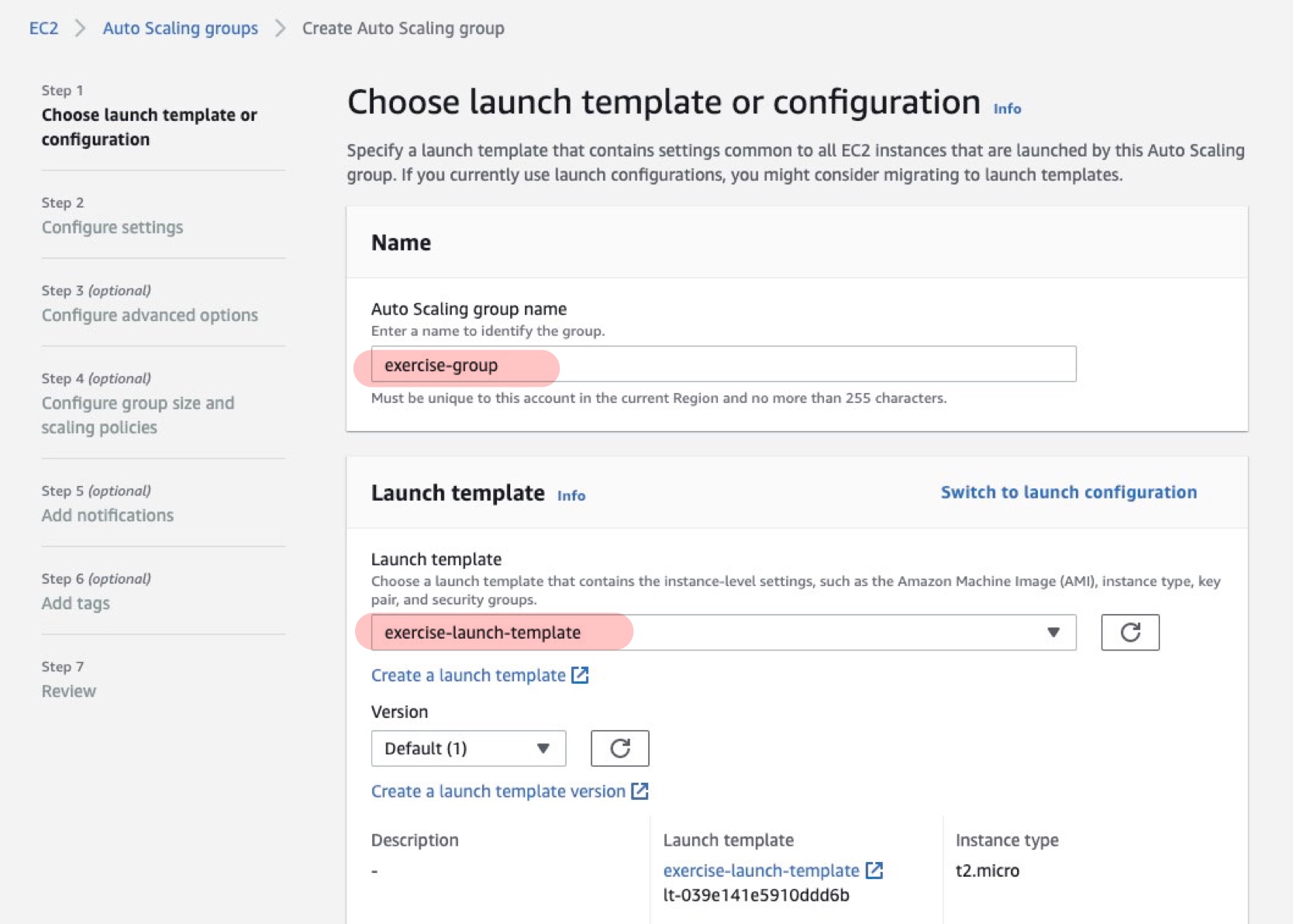 기존의 EC2 인스턴스를 이용해 AMI Image를 생성하고, 이를 이용해 시작 템플릿을 만들었습니다. 이제 Auto-Scaling Group을 생성하면 됩니다. 우선 그룹 명과 시작 템플릿을 설정해 줍니다.