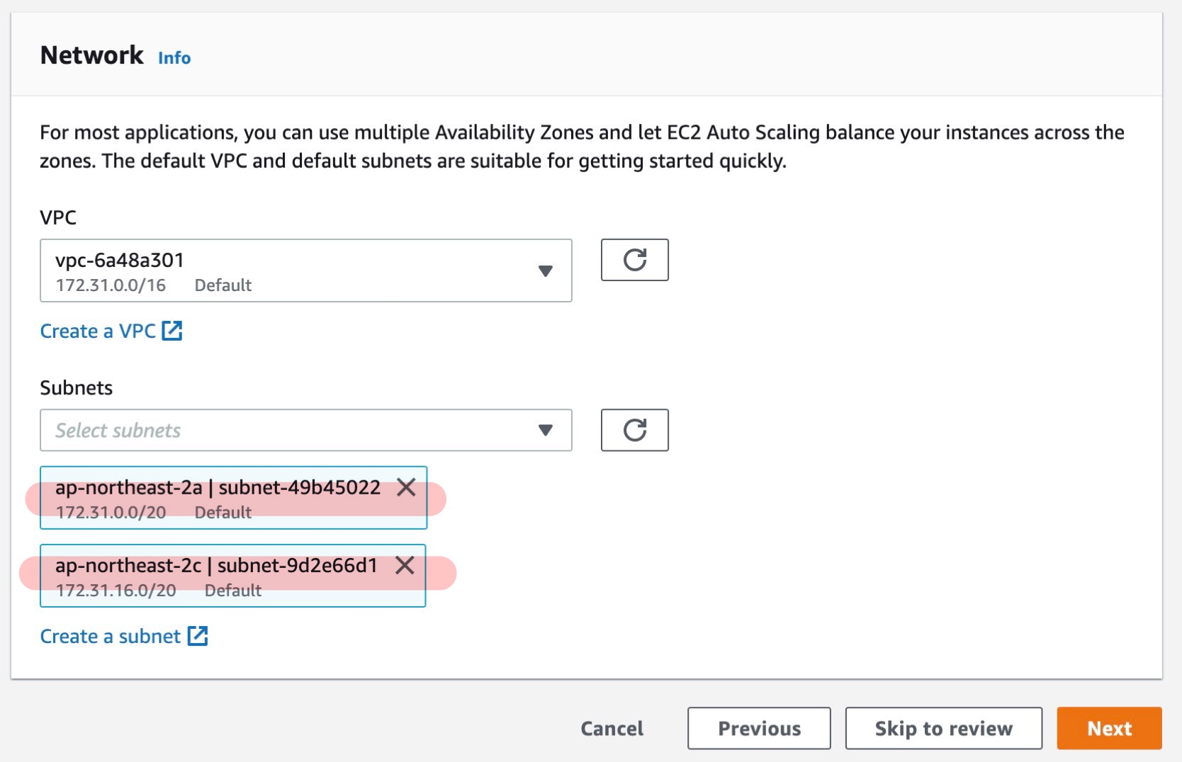 서브넷을 통해 인스턴스들을 어떤 네트워크 망에 띄울지 설정할 수 있습니다. 여기서는 ap-northeast-2a, ap-northeast-2c를 기본값으로 설정했습니다. 생성한 인스턴스의 반은 서울 리전 a 가용 영역에, 나머지 반은 서울 리전 c 가용 영역에 생성하게 됩니다.