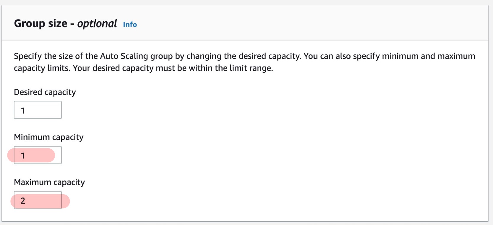 그리고 Auto Scaling Group의 목표 용량(Desired Capacity)와 최소 용량(Minimum Capacity)를 모두 2로 수정해 인스턴스가 한 대 더 생성되도록 합니다.