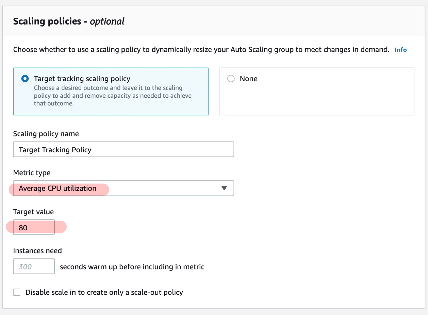 다음으로 Auto scaling 그룹의 사이즈 및 scaling policy를 설정해 줍니다. 여기서는 Auto Scaling 그룹 내에서 CPU 사용률 80% 기준으로 인스턴스의 수가 최소 1대에서 최대 2대까지 자동으로 변하도록 설정했습니다.