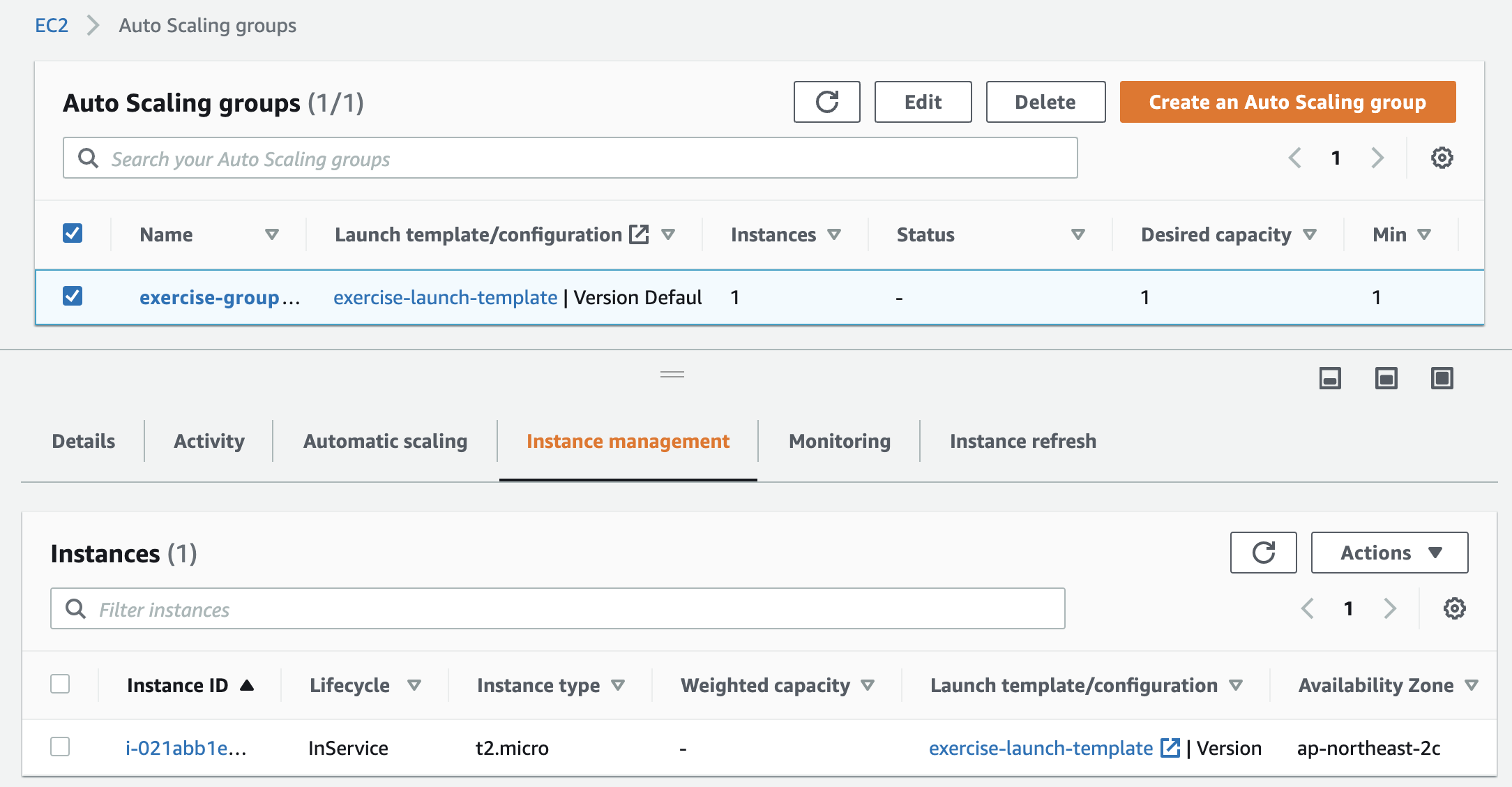 설정을 마치고 그룹 생성을 하면 아래와 같이 Auto Scaling Group이 생성된 것을 확인할 수 있습니다.