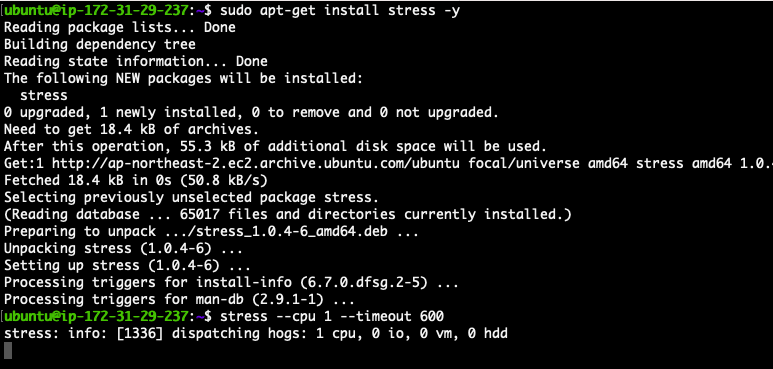 stress를 사용해 원하는 CPU의 수를 원하는 시간만큼 100% 사용하게 할 수 있습니다. 저는 EC2에 ubuntu가 설치 돼 있으므로 아래와 같이 설치 후 stress를 실행시켰습니다.