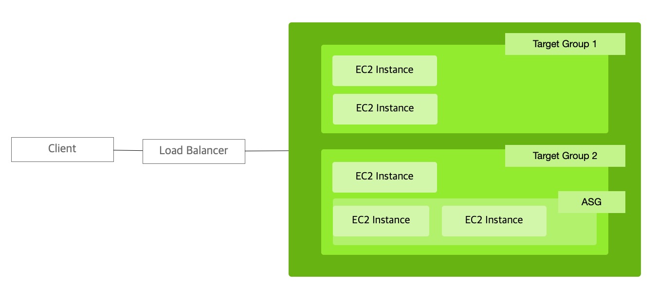 대상 그룹(Target Group)은 로드 밸런서가 요청을 전달할 서버 그룹이라 생각할 수 있습니다. 대상 그룹에는 인스턴스나 Auto Scaling Group을 포함할 수 있습니다. 로드 밸런서에서 요청한 포트에 따라 다양한 대상 그룹이나 인스턴스로 요청을 전달할 수 있습니다.