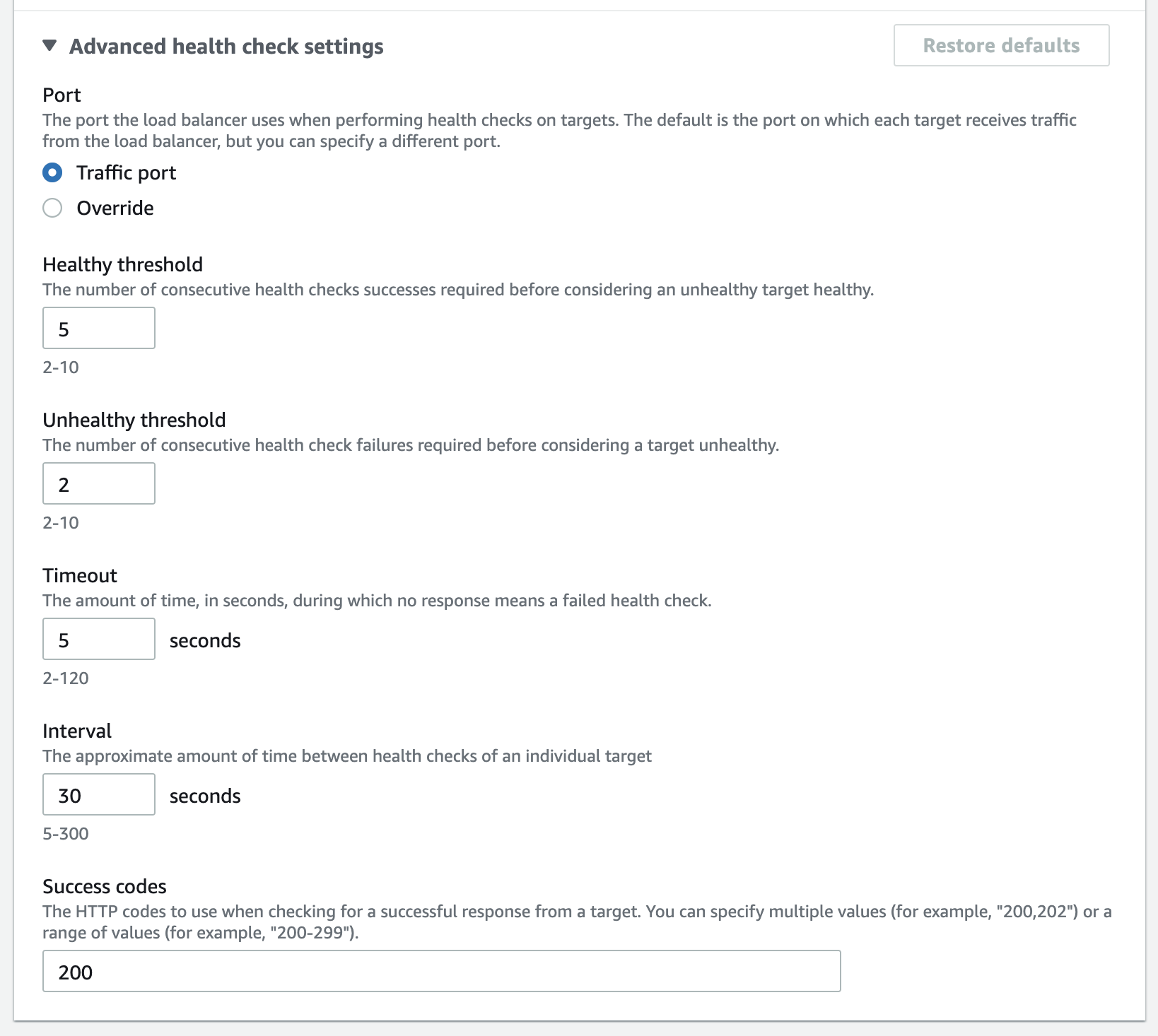 로드 밸런서 대상 그룹의 상태 검사(Health Check) 설정 페이지에서 Health Check 관련 아래 항목들을 설정할 수 있습니다.
