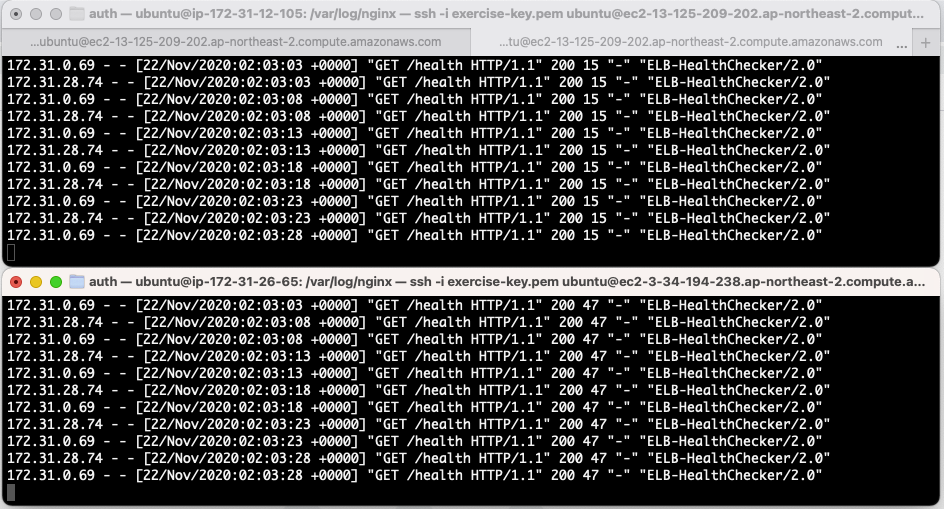 각 인스턴스로 들어오는 요청 확인을 위해 nginx의 access.log를 실시간으로 확인해 보도록 합니다. 각 인스턴스에 SSH로 접속 후 /var/log/nginx 폴더로 이동 후 실시간 로그를 확인합니다.