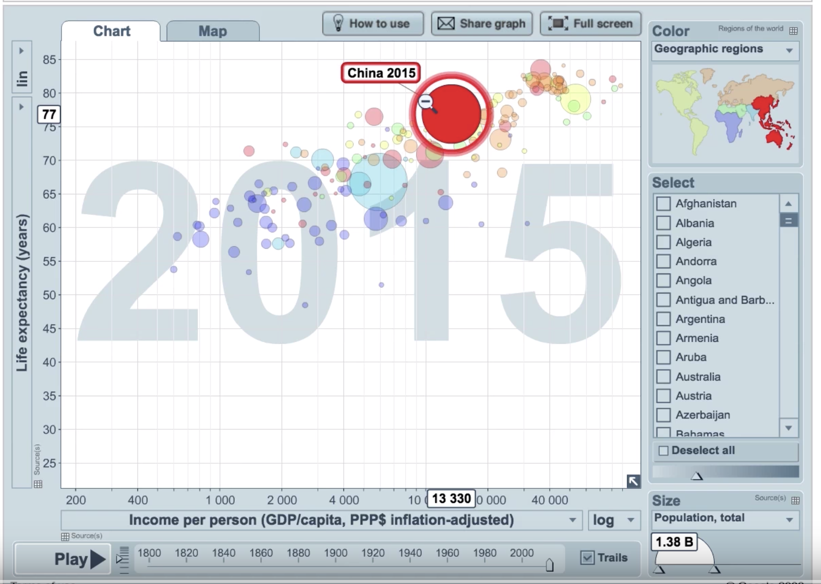 아래의 사진은 의사이며 유명한 통계학자인 Hans Rosling의 데이터 시각화 자료입니다. 아래 차트와 차트 내 가장 큰 Circle인 중국을 D3로 만들어 보며, D3의 기본적인 개념을 익히도록 하겠습니다.