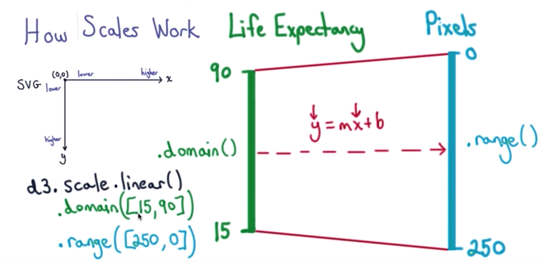 이를 위해서 우리는 input data를 픽셀 값으로 변경해주는 함수가 필요할 것입니다. D3의 domain 메소드를 이용해 input값을 참조하고, range 메소드를 이용해 output 값을 참조할 수 있습니다. domain method를 이용해 기대수명의 범위인 15 ~ 90을 지정해주고, range 메소드에는 기대수명에 상응하는 원하는 범위의 픽셀 값을 지정해줍니다.