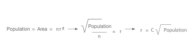 Gapminder의 그래프에서 각 원은 해당 국가의 인구를 나타냅니다. 따라서, 원의 크기는 중국의 인구수 13억에 상응해야 합니다. 넓이를 구하기 위해 반지름을 도출해야 하는데 아래와 같이 반지름은 square root 인구수에 상수를 곱한 값으로 정리할 수 있습니다.