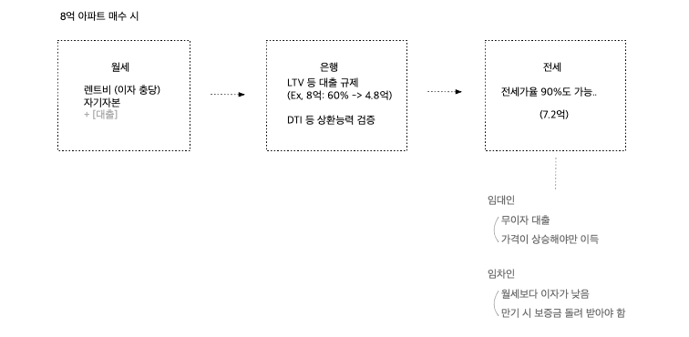 8억 아파트 매수를 한다고 했을 때, 월세는 자기자본 + 대출을 받고 대출 이자는 렌트로 충당하게 됩니다. 은행 대출을 이용한다면, 규제가 있다고 했을 때 60%까지 대출이 가능하다면 4.8억 대출을 받고 나머지 차액은 자기 자본이 필요합니다. 이것을 전세로 돌리면 극단적으로는 상승장에서는 90%까지도 가능하니까, 7.2억을 무이자로 받을 수 있고 나머지 8천만원 차액만 있으면 매수가 가능합니다.
