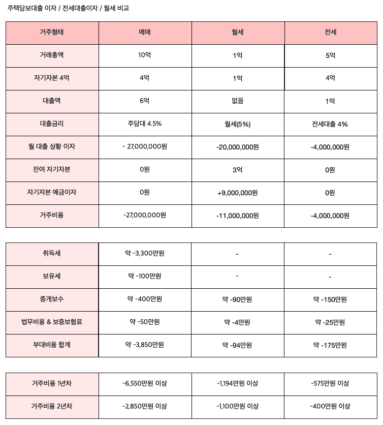 아래 표는 같은 내용을 좀 더 세부적으로 넣어본 건데요. 매매인 경우는 취득세나 보유세 등 세금도 추가되서 거주 1년차 비용이 매우 큽니다. 그래서, 보시면 아시겠지만, 만약에 하락장에서 집 계약을 새로 하고 한 3~5년만 지나도 전월세에 비해 금융비용 차이가 매우 커 질 수 있습니다.