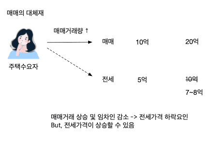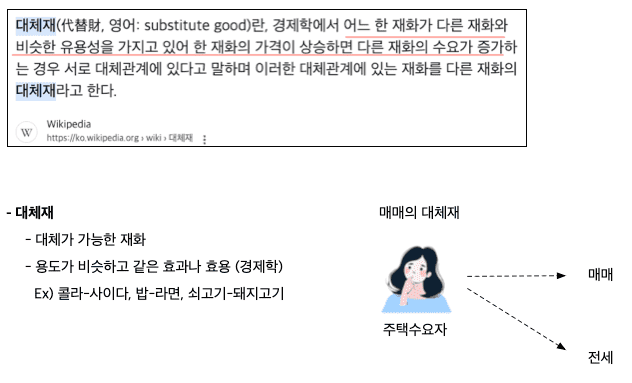 전세와 매매는 대체제 관계입니다. 경제학 이론에 따르면, 어느 한 재화가 다른 재화와 비슷한 유용성을 가지고 있고, 한 재화의 가격이 상승하면 다른 재화의 수요가 증가하는 경우 서로 대체관계에 있다고 합니다. 그래서, 대체제는 서로 다른 두 물건이 있고 대체가 가능한 재화 또는 용도가 비슷하고 같은 효과나 효용을 가집니다.